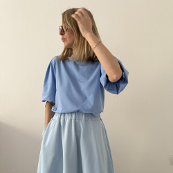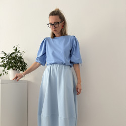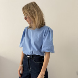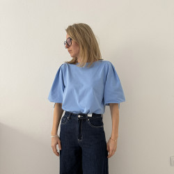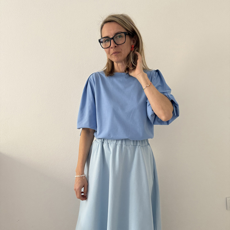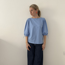 Tričko je rovného strihu, s jemným lodičkovým výstrihom. Na ramenách má 2 protisklady, je nazberané v oblasti lakťov do patentu z rovnakého materiálu ako je tričko. V patente je šnúrka na stiahnutie rukávov, vďaka čomu si viete upravovať dĺžku a vytvoriť tak 2 rôzne strihy.